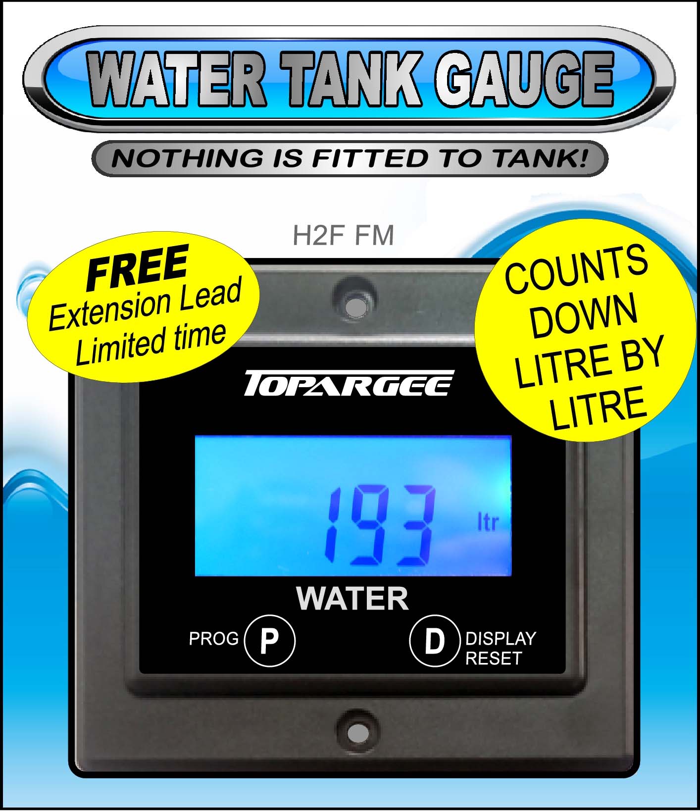 TOPARGEE is proud to offer our own exclusive product range and we are the Australian & New Zealand agent for a number of quality products in the RV & Marine markets. Home of the TOPARGEE Digital RV Water Tank Gauges. Our new H2F-FM Water Tank Gauge now features a larger backlit screen that actually shows the number of litres remaining in your tank, rather than the traditional full/half/empty display.
