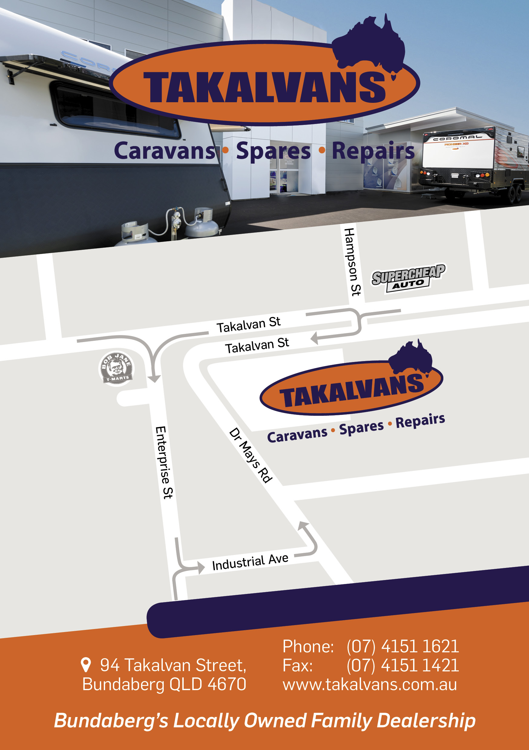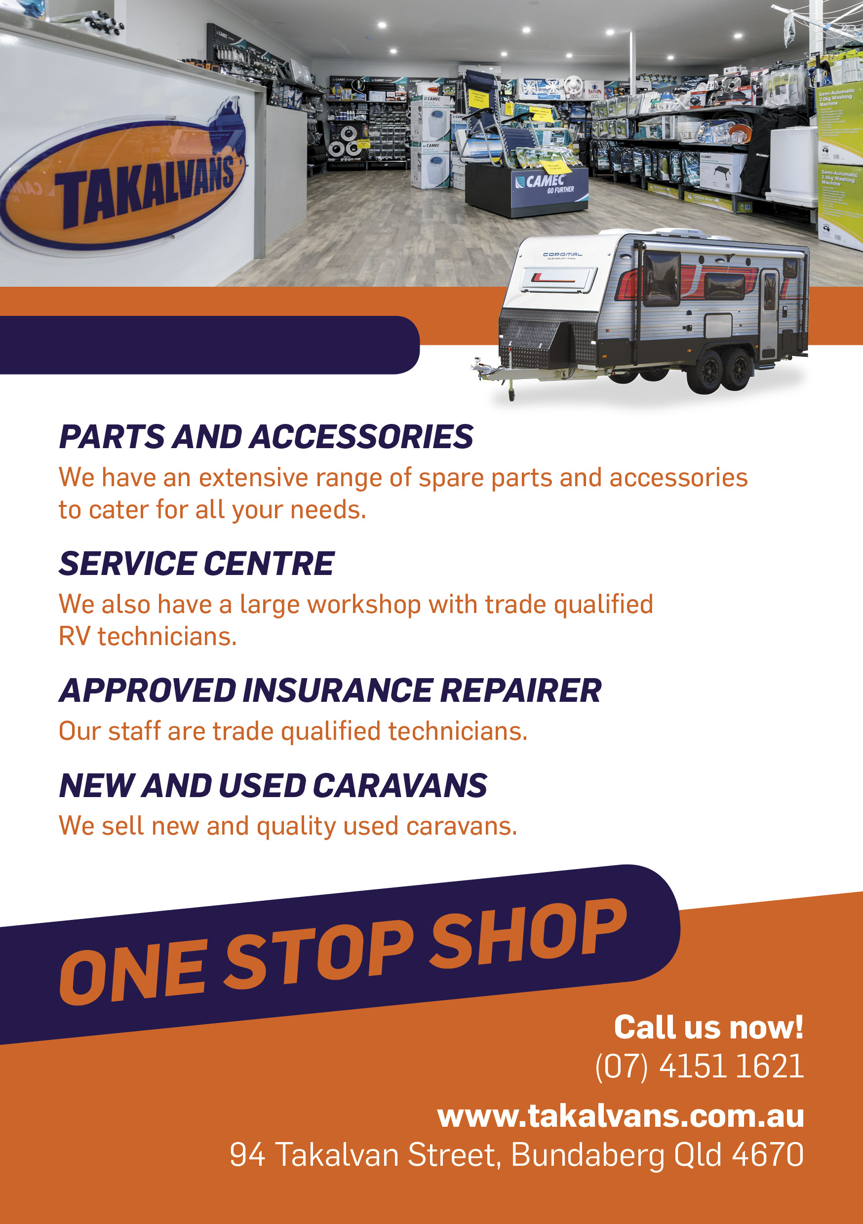 Takalvans is owned and operated by Dale Rethamel and wife Natalie who both share a philosophy of over-delivering to their local and passing trade. They are Bundaberg's most experienced and longest serving caravan dealers. Services include an extensive spare parts division that carries a huge selection of spares and accessories, including notable brands Camec and Dometic. We are excited to boast the fact that they are the regions only appointed camec recreational vehicle specialist (CRVS) store. Insurance repairs are our speciality. Takalvans have seven tradesmen of various trade backgrounds working at the dealership. This gives the customer the reassurance that only the most qualified person is working on their caravan or RV. Takalvans are the preferred repairer for most insurance companies, along with general service and maintenance work for most brands of caravans and RV.